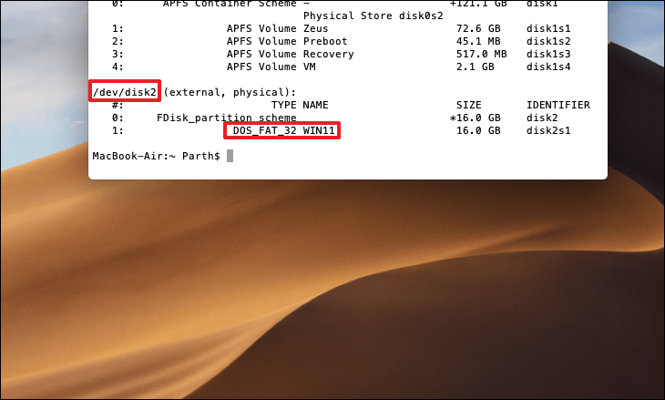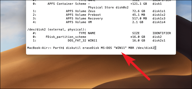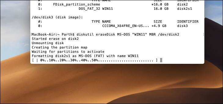 diskutil eraseDisk MS-DOS "WIN11" MBR /dev/disk2