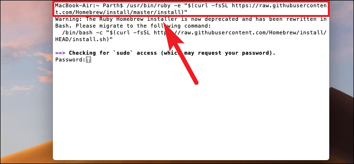 /usr/bin/ruby -e "$(curl -fsSL https://raw.githubusercontent.com/Homebrew/install/master/install)"Note: If Homebrew is already installed, you can skip this step.