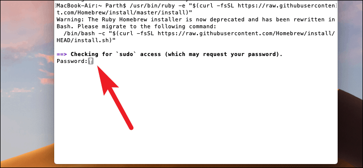 - When prompted, enter your Mac user password and press Enter. The password input may not be visible; this is normal.