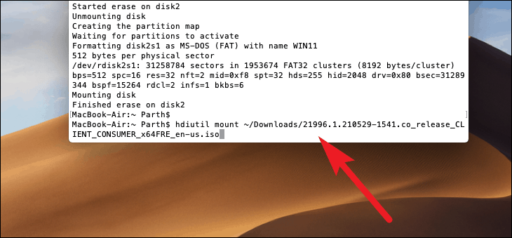 - Mount the Windows 11 ISO file. If it's in your 'Downloads' folder, use the following command in Terminal (replace <file-name-here> with the actual file name of the ISO):