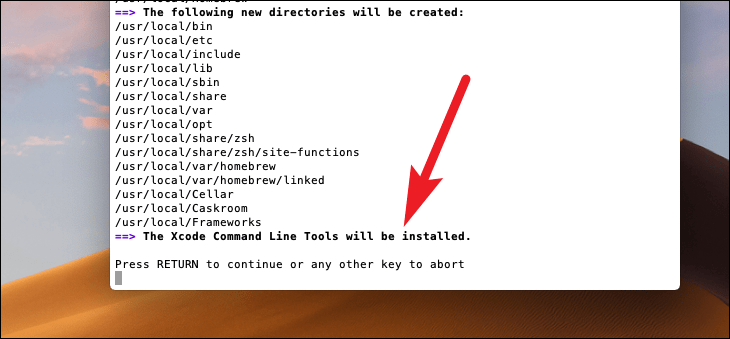 - Press Enter again to install the Xcode Command Line Tools when prompted.