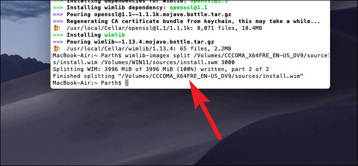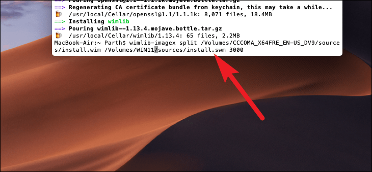 install.wimfile into smaller parts that can be stored on the FAT32-formatted USB drive. Run the following command (replace <Your mounted File Name here> with the name of the mounted ISO volume):