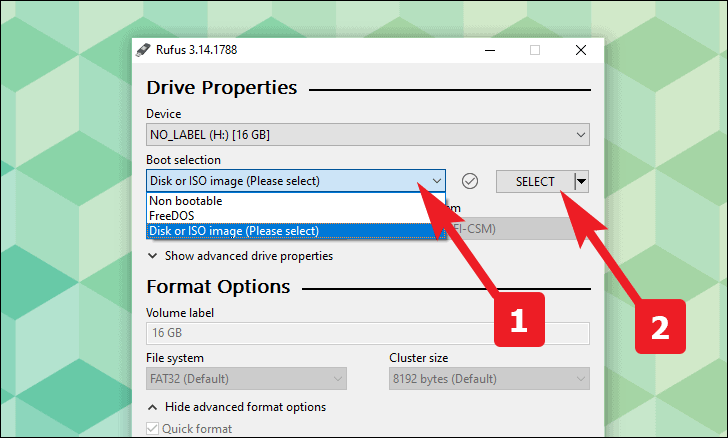 Step 4: Under the Boot selection section, ensure Disk or ISO image is selected. Click the SELECT button to browse and choose your Windows 11 ISO file.