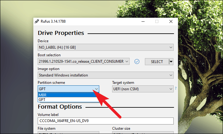 Step 8: Back in Rufus, select the appropriate partition scheme under the Partition scheme section. Choose MBR if your BIOS mode is Legacy, or GPT if it is UEFI.