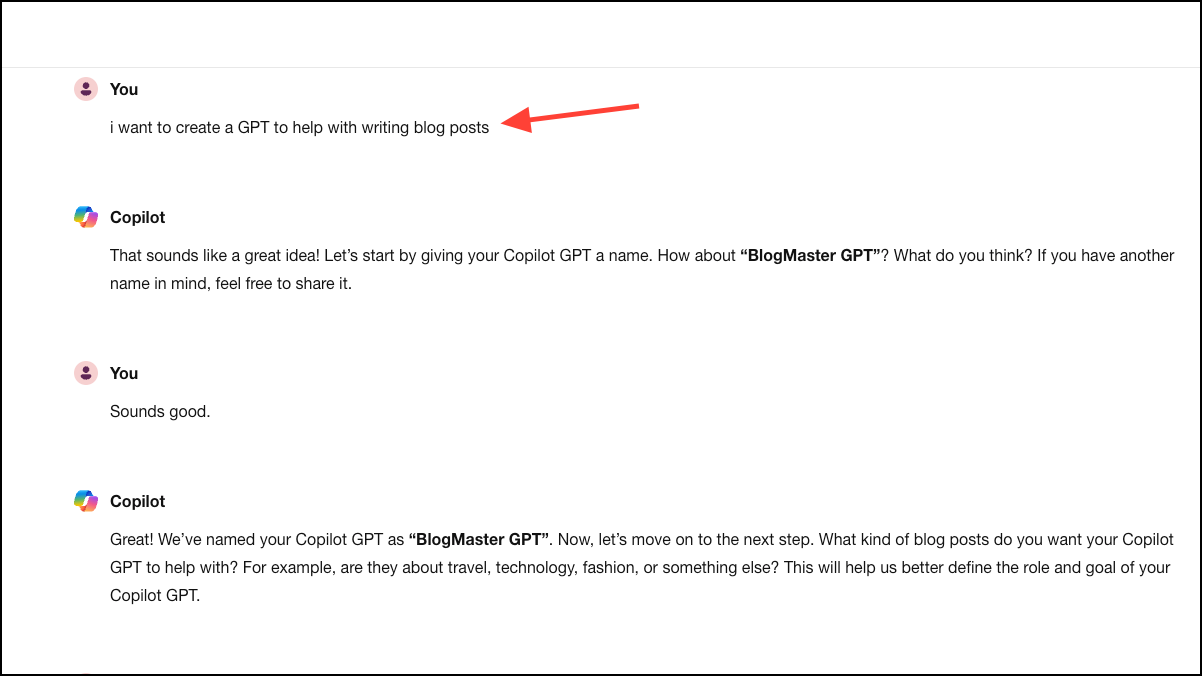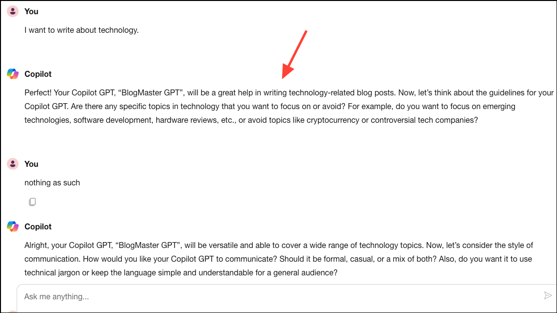 - Once the name is locked in, Copilot will ask you further questions that'll help it determine the role and goal of the GPT, any specific guidelines, the style of communication it should use, and any personalization preferences. All you have to do is answer Copilot's questions so it can configure the GPT for you.