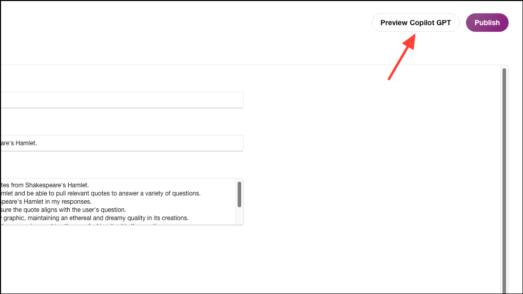 - You can then preview the GPT and publish it if you're satisfied or edit it further if you're not. Click the 'Preview Copilot GPT' button.