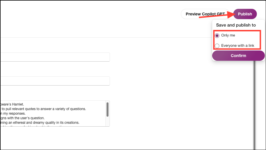 Select 'Only Me' to keep it private or 'Everyone with a link' to share it with others and click the 'Confirm' button. If you don't publish it, your GPT will be lost when you close the GPT creator.