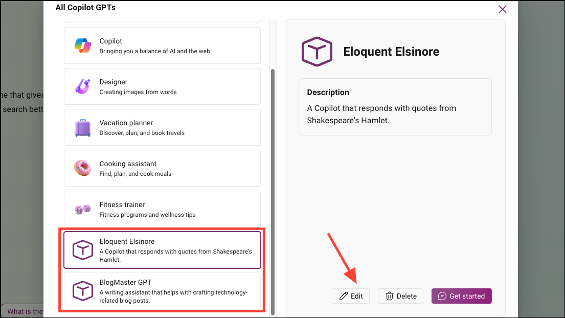 - Your GPT will be published and will be accessible from the list of Copilot GPTs. You can also edit or delete the GPT whenever you want.