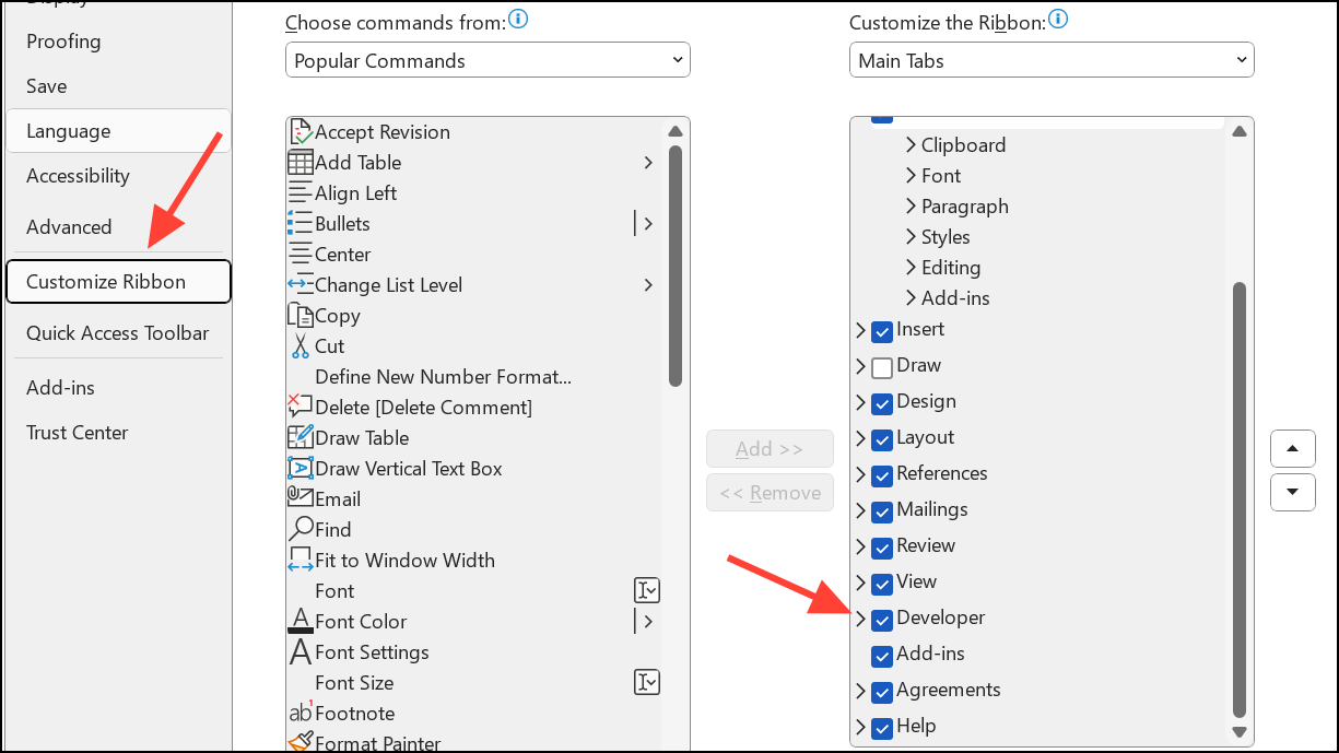 Step 2: Enable the Developer tab, which contains all the tools required for form creation. To do this, go to File > Options > Customize Ribbon, then in the right column, check the box next to Developer and click OK. The Developer tab will now appear in your ribbon at the top of Word.