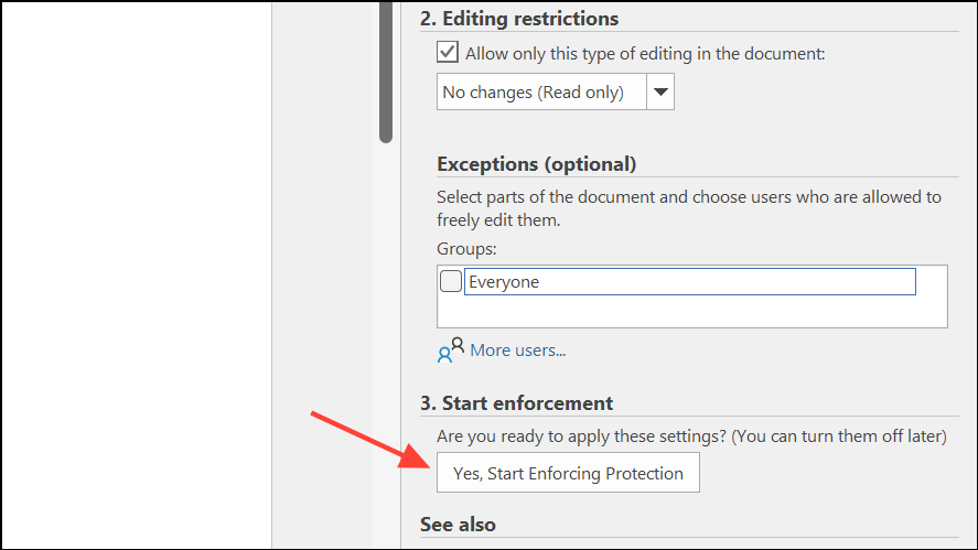 Step 7: Click Yes, Start Enforcing Protection, then set a password if you want to prevent others from turning off protection. This step ensures users can only fill in the designated fields while the rest of the document remains locked.