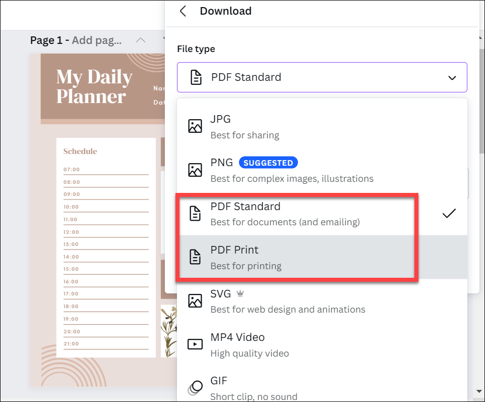 Depending on whether you want to use it in print or as a digital planner, select the PDF format. If you want to print it, select ‘PDF Print’ as the type. Otherwise, select ‘PDF Standard’ to use it as a digital planner.