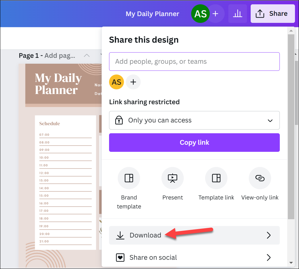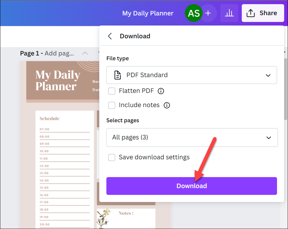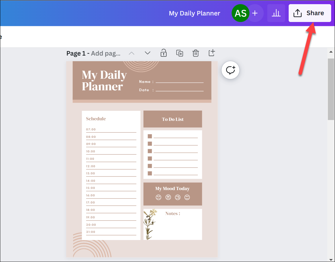 Once your planner is complete, you can download it. Click the ‘Share’ button in the top-right corner of the screen.