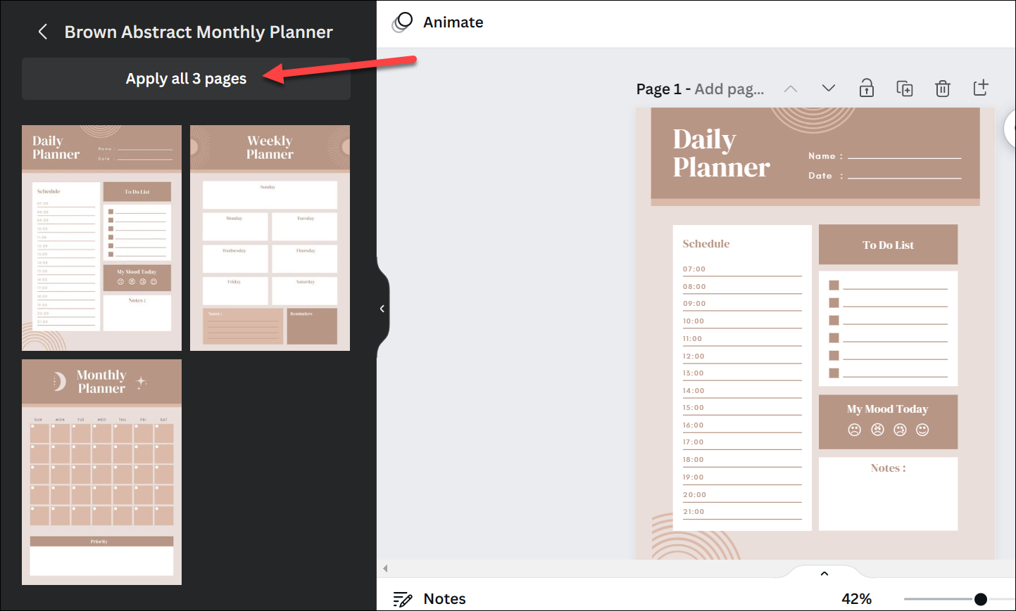 Some templates also have all three types of pages if you want to create all three in a consistent theme. Click on the template in that case and add each page one by one on a new page in this case. That is, first, for page one, click on ‘Daily Planner’, for example. Then, click on ‘Add Page’ from the right to add a design page and then, select the ‘Weekly Planner’ template and similarly, add the ‘Monthly Planner’ template to the new page. You can also directly click the ‘Apply All Pages’ button.