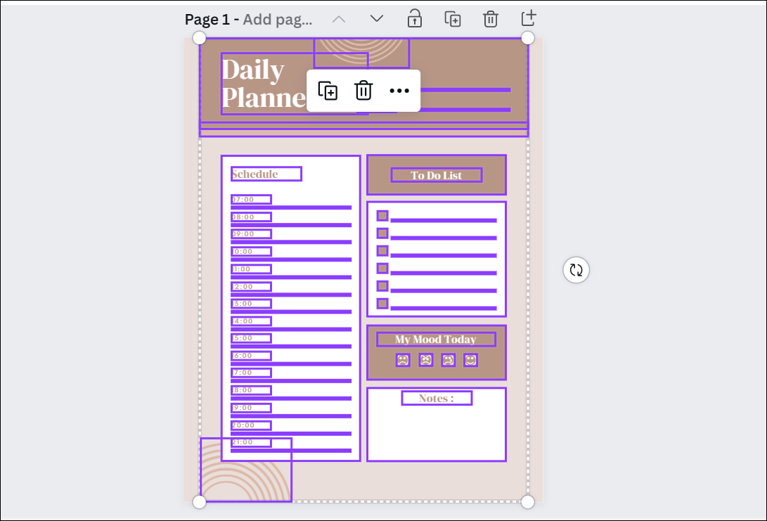 Every element on the planner is customizable and you can move it around or even delete it. To see all the separate customizable elements, here’s a trick for you. Click the left mouse button and drag it across the entire page or you can also use the Ctrl + A (Windows)/ Cmd + A (Mac) keyboard shortcut. All the elements on the design that you can separately customize will be highlighted in separate blue boxes.