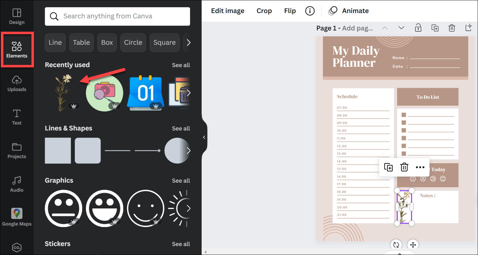 You can also add additional elements like stickers, icons, illustrations, images, speech bubbles, and much more. Click the ‘Elements’ tab from the left toolbar to insert graphics, photos, videos, stickers, etc. in your planner design.