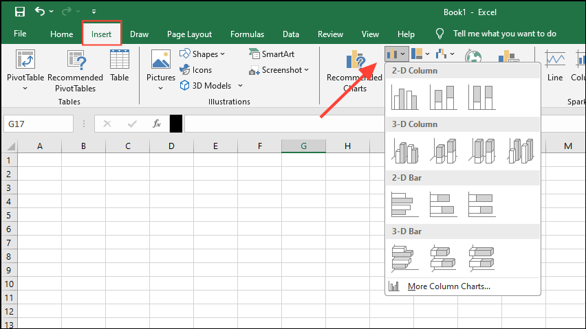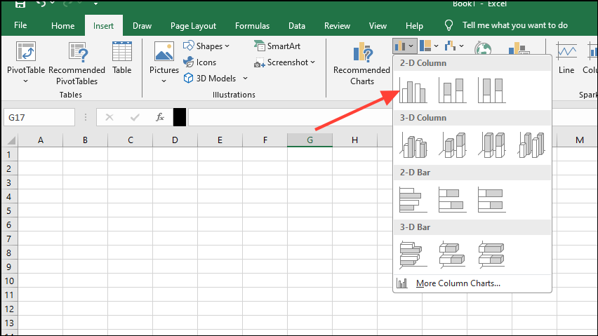 - In the dropdown menu that appears, click on the 'clustered column' icon. The icons may appear differently if you're using an older version of Excel.