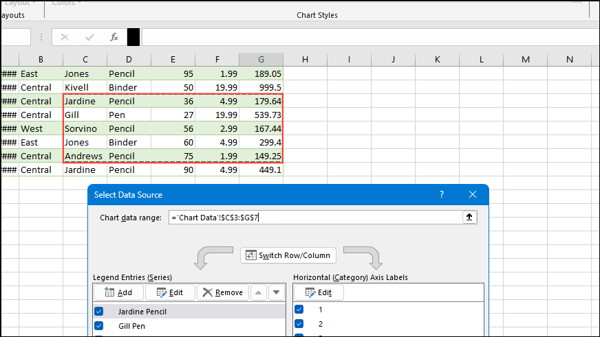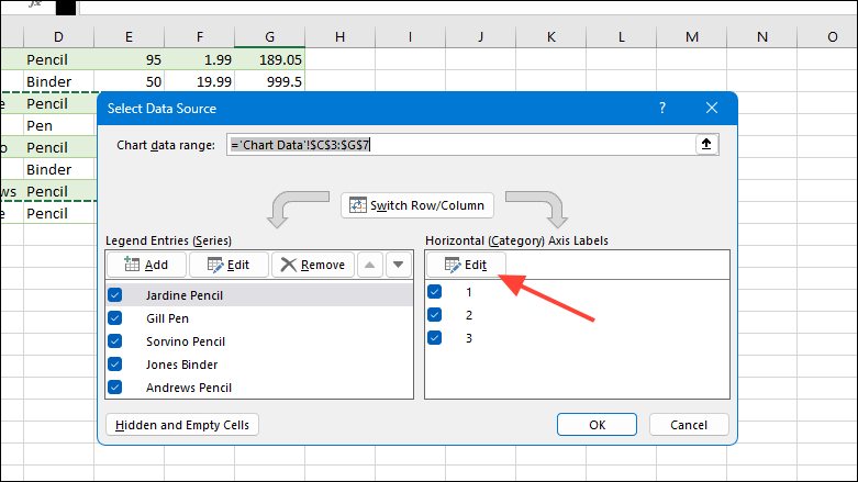 - This will bring up the 'Select Data Source' dialog box. Click on the Edit button under 'Horizontal (Category) Axis Labels' before selecting the data you want to display.