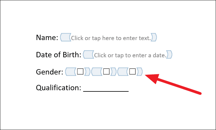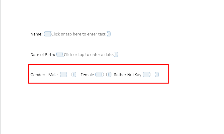 Step 1: To add checkboxes for Gender, place your cursor next to the label. In the Developer tab, click on the Check Box Content Control icon.