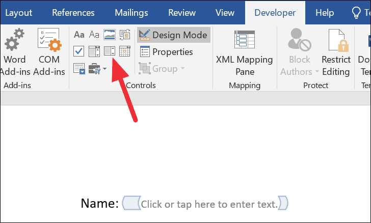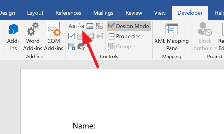 Step 2: In the Controls group, click on the Plain Text Content Control icon. This icon is represented by a document with the letters "Aa" and is located next to the bolded "Aa" icon.
