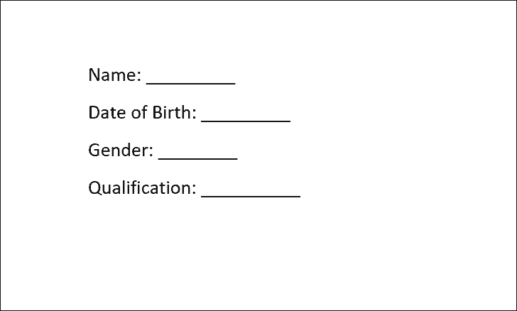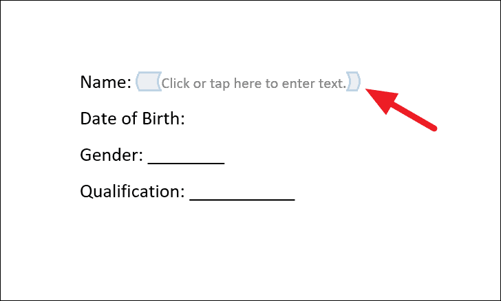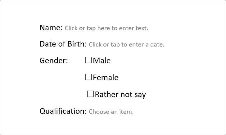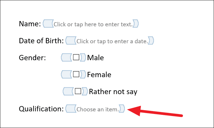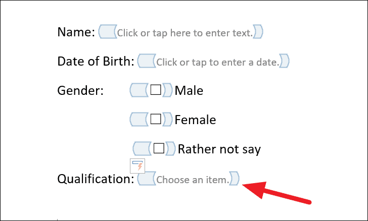Step 1: For the Qualification field, place your cursor next to the label. In the Developer tab, click on the Drop-Down List Content Control icon, which is located next to the calendar icon.