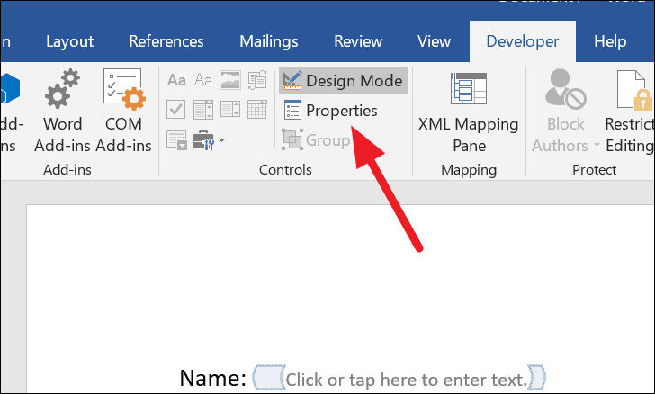 Step 2: To add items to the drop-down list, select the control by clicking on it, then click on Properties in the Developer tab.