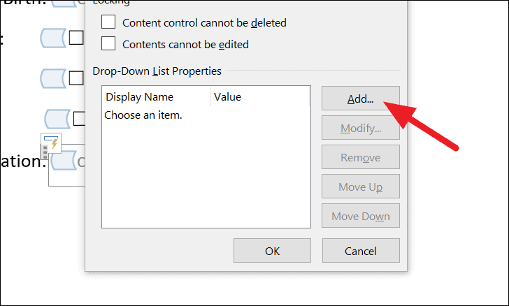 Step 3: In the Content Control Properties dialog box, click on the Add button under the Drop-Down List Properties section.