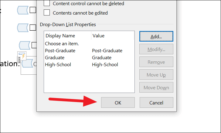 Step 5: Repeat the process to add other options such as Graduate and High School. Once all options are added, click OK in the Content Control Properties dialog box.