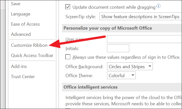 The Word Options dialog box will open. From the list on the left, choose Customize Ribbon to access settings for the ribbon and keyboard shortcuts.