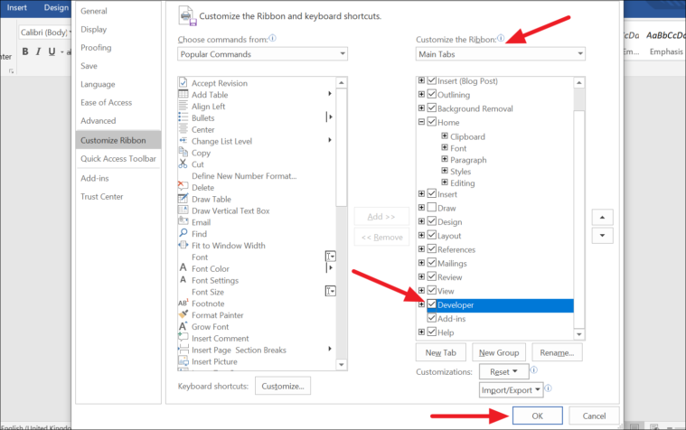 In the Customize the Ribbon section on the right, scroll through the list of main tabs until you find Developer. Check the box next to Developer, then click OK to add it to the ribbon.