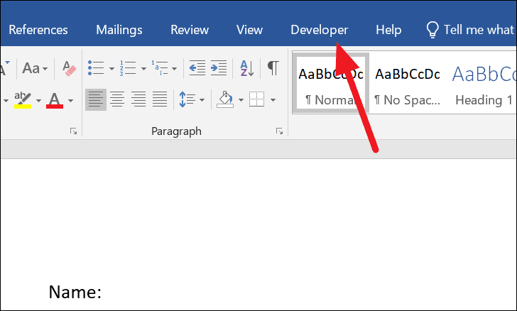 Step 1: Place your cursor next to the label Name where you want the text box to appear. Go to the Developer tab in the ribbon.
