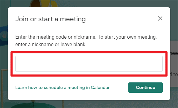 Step 2: A dialog box will appear prompting you to enter a meeting nickname. You can enter a nickname that members of your organization can use to quickly join the meeting, or you can leave it blank to generate a unique meeting link. Afterward, click on the Continue button.