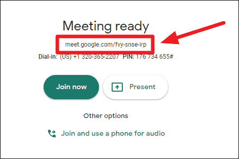 Step 3: Once the Meet room is created, you'll see a Meeting ready screen displaying your Google Meet link. This link can be shared with anyone you wish to invite, including those outside your organization.