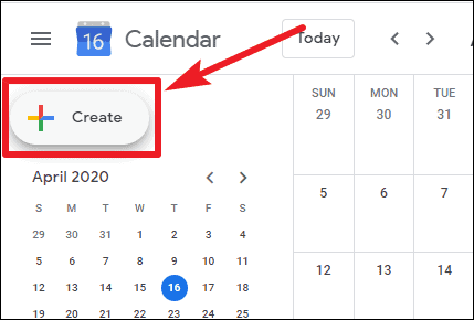 Step 1: Click on the Create button located at the top-left corner of the page to begin scheduling your meeting.
