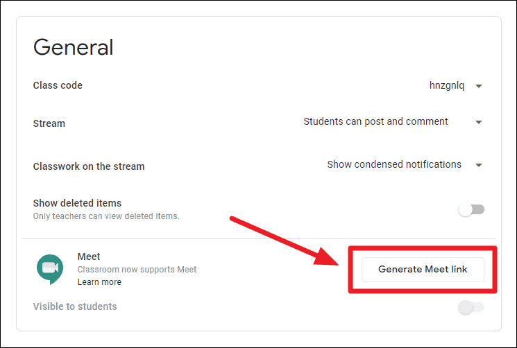 Step 3: In the General section of the settings, find the option labeled Generate Meet link and click on it. This will create a unique Google Meet link for the class.