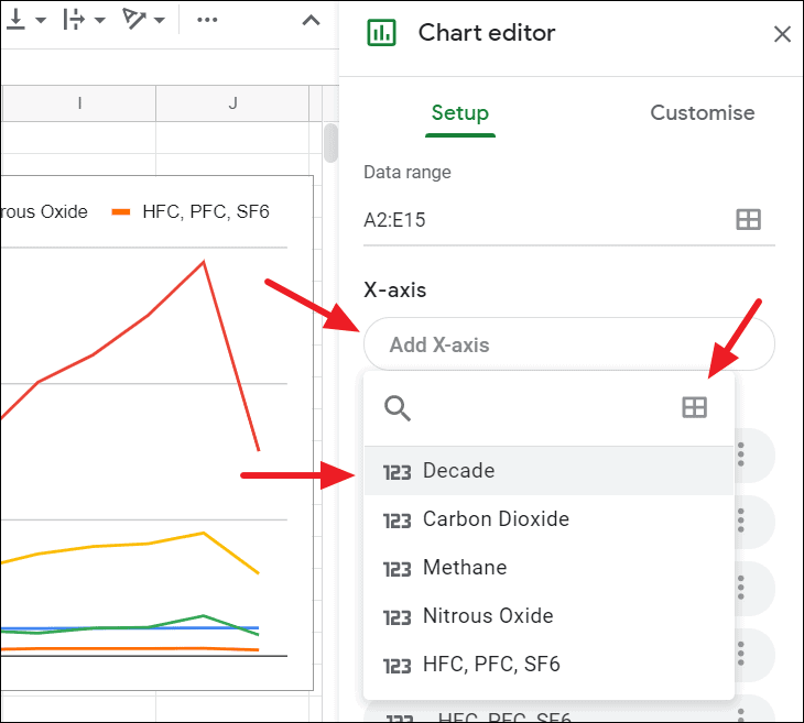 Go to the ‘Setup’ in the Chart editor, click on the X-axis field and choose ‘Decade’. Or if you want to add a column directly from a table, click on the ‘Select a data range’ icon and select the range.