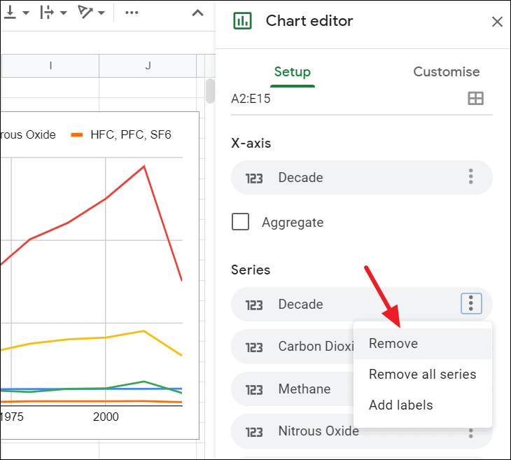 Now, we need to remove Decade from the data series. To do that, click on the ‘three-dot icon’ on the ‘Decade’ option under the Series section and select ‘Remove’.