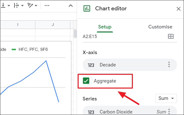 But now the time scale on the x-axis only shows every 25 years. To change that, select the ‘Aggregate’ option under the X-axis section in the Chart ‘Setup’.