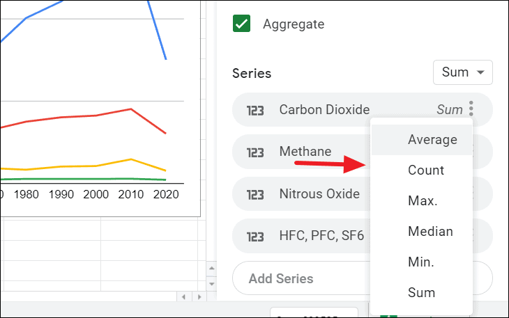 When you select the Aggregate option, it will give you options on how you want to display your Series data. Click on the aggregate type next to the three-dot icon on each series and choose one of the aggregate types.