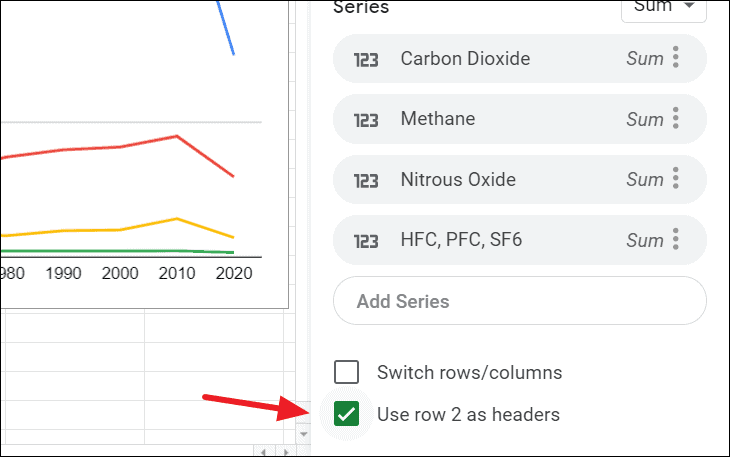 Use row 2 as Headers: This setting lets you choose whether the first row of the selected dataset should be used as the header (legend) of the chart or not. In our dataset, the data starts at row 2.