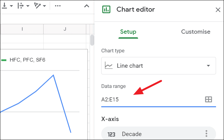 If you want to change source data for your line chart, you can do that by clicking on the ‘Data range’ option in the Chart setup.