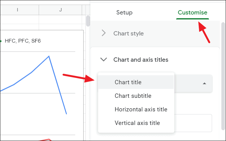 Open ‘Chart and axis title section’ under the ‘Customize’ tab, click the drop-down menu that says ‘Chart title’, and choose which title you want to add.