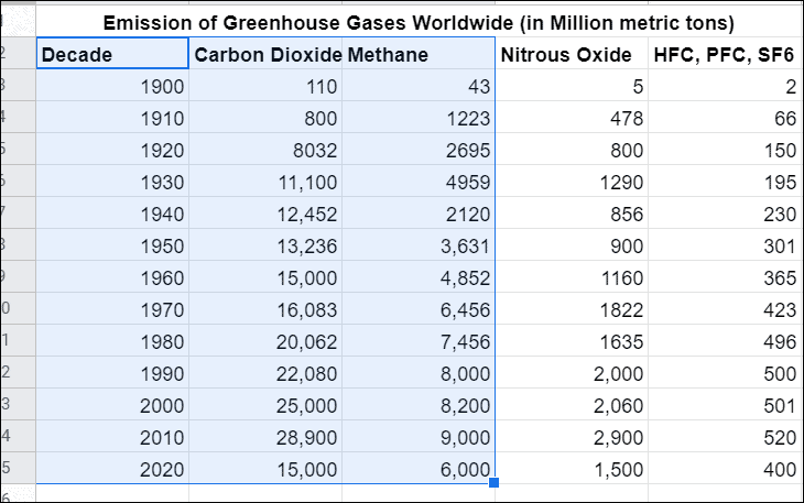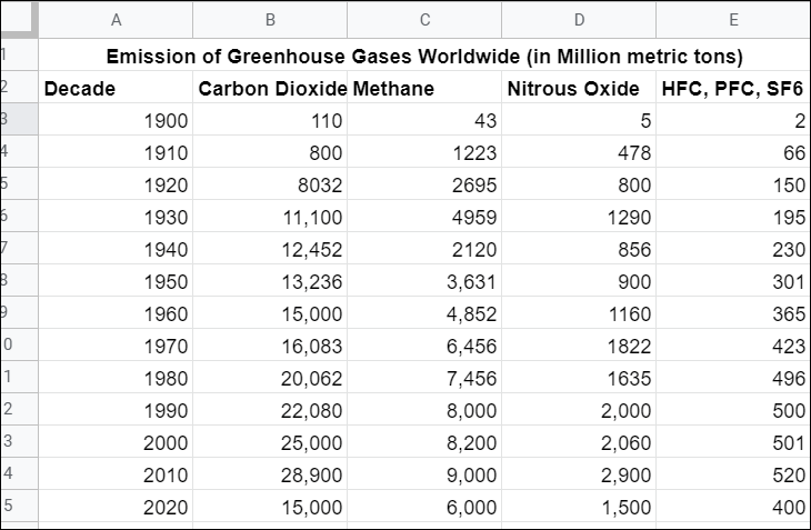 We will use this sample dataset to create a line graph in Google Sheets: