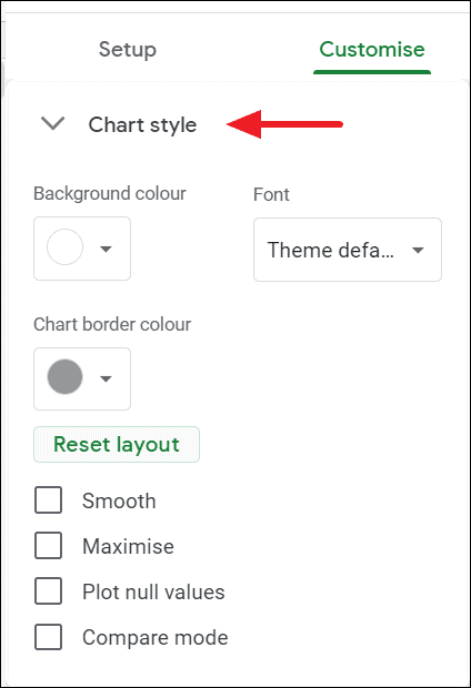 The chart Style section of the Customise tab provides you different layout options to change the chart’s border color, fonts, background color as well as different layout styles.