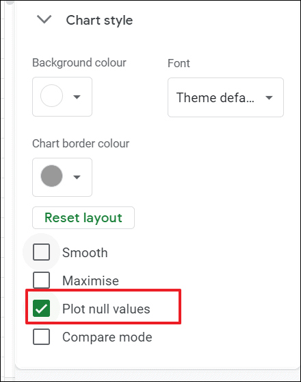 Plot null values. If there are any blank cells (null values) in your source dataset, usually you would see breaks in the line. But checking this option will plot them and you will see not see any breaks in the line.