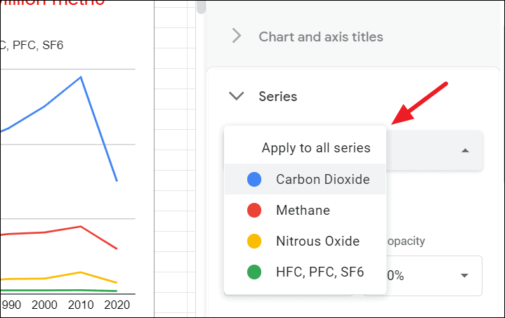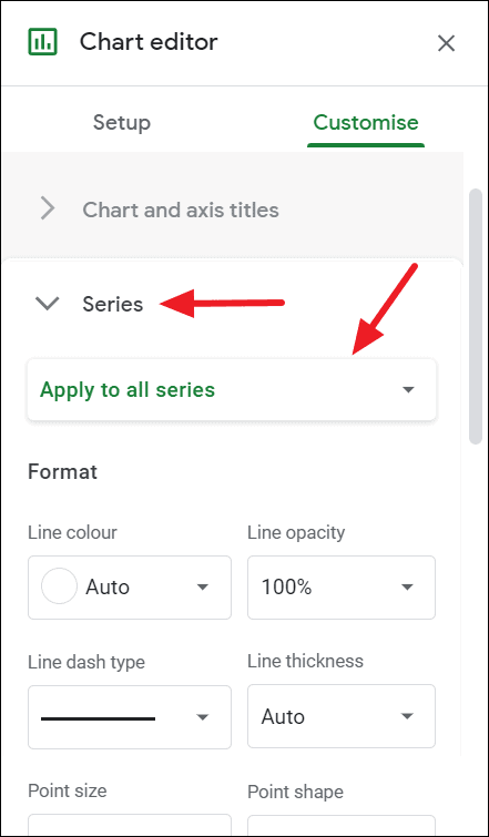 Click on the ‘Apply to all series’ drop-down under the Series section to choose whether you want the format all the series at once or a specific series. You can select each individual series and format them separately.