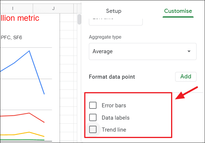 This section also allows you to add error bars, data labels, and trend lines to your line chart. You can even customize individual data points by clicking on the ‘Add’ button next to ‘Format data point’.
