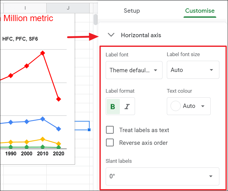 The next section is the horizontal axis, which provides you options to change the label’s font, size, format as well as text color of the label on the X-axis. You can also create labels as text by ticking the ‘Treat label as text’ option and reverse the axis order by checking the ‘Reverse axis order’ box.
