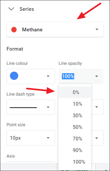 To turn a line invisible, first, choose which line you want to turn invisible in the Series drop-down menu. Then, click on the ‘Line opacity’ drop-down and select ‘0%’.