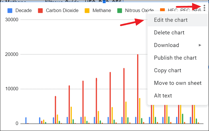 To do that, click on the ‘three dots (vertical ellipsis)’ at the top-right corner of the chart and select the ‘Edit chart’ option or just double-click on the chart.