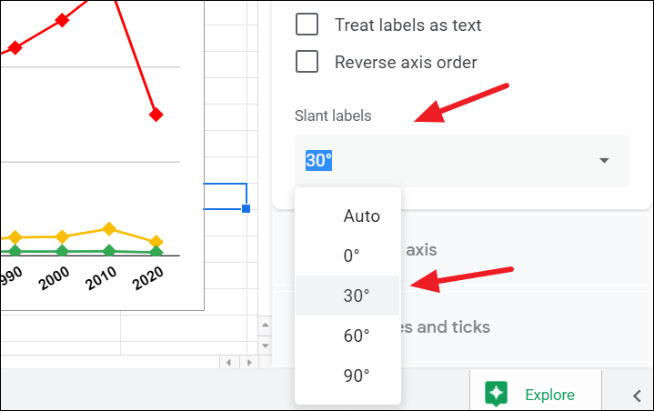 Another useful option you have here is ‘Slant labels’, which makes your horizontal labels slant at a specific angle. To do that, click on the ‘Slant labels’ drop-down and choose an angle.